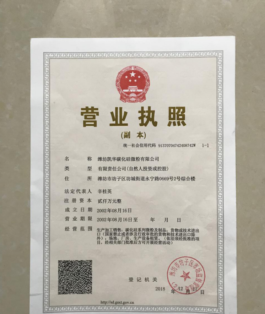濰坊凱華碳化硅微粉有限公司成立于2002年,國(guó)家高新技術(shù)企業(yè),公司占地40畝,標(biāo)準(zhǔn)廠房19000平方,辦公樓、研發(fā)處2000平方,年生產(chǎn)能力3萬(wàn)噸。一直從事陶瓷級(jí)微粉的生產(chǎn)銷售,所生產(chǎn)的超細(xì)碳化硅微粉具有純度高、粒形好、穩(wěn)定性強(qiáng)等特點(diǎn),主要用于反應(yīng)燒結(jié)、無(wú)壓燒結(jié)、硅碳棒新工藝、重結(jié)晶燒結(jié)、蜂窩陶瓷、機(jī)車(chē)制動(dòng)裝置、研磨拋光、金屬防腐表面噴涂、納米隔熱保溫材料等領(lǐng)域。標(biāo)準(zhǔn)產(chǎn)品有:F240、F1200、W40、W28、W20、W14、W10、W7、W5、W3.5、 W2.5、W2、W1.5、W0.5、5S、D3E、100F、RS07、RS100及整形高密度系列綠碳化硅微粉......